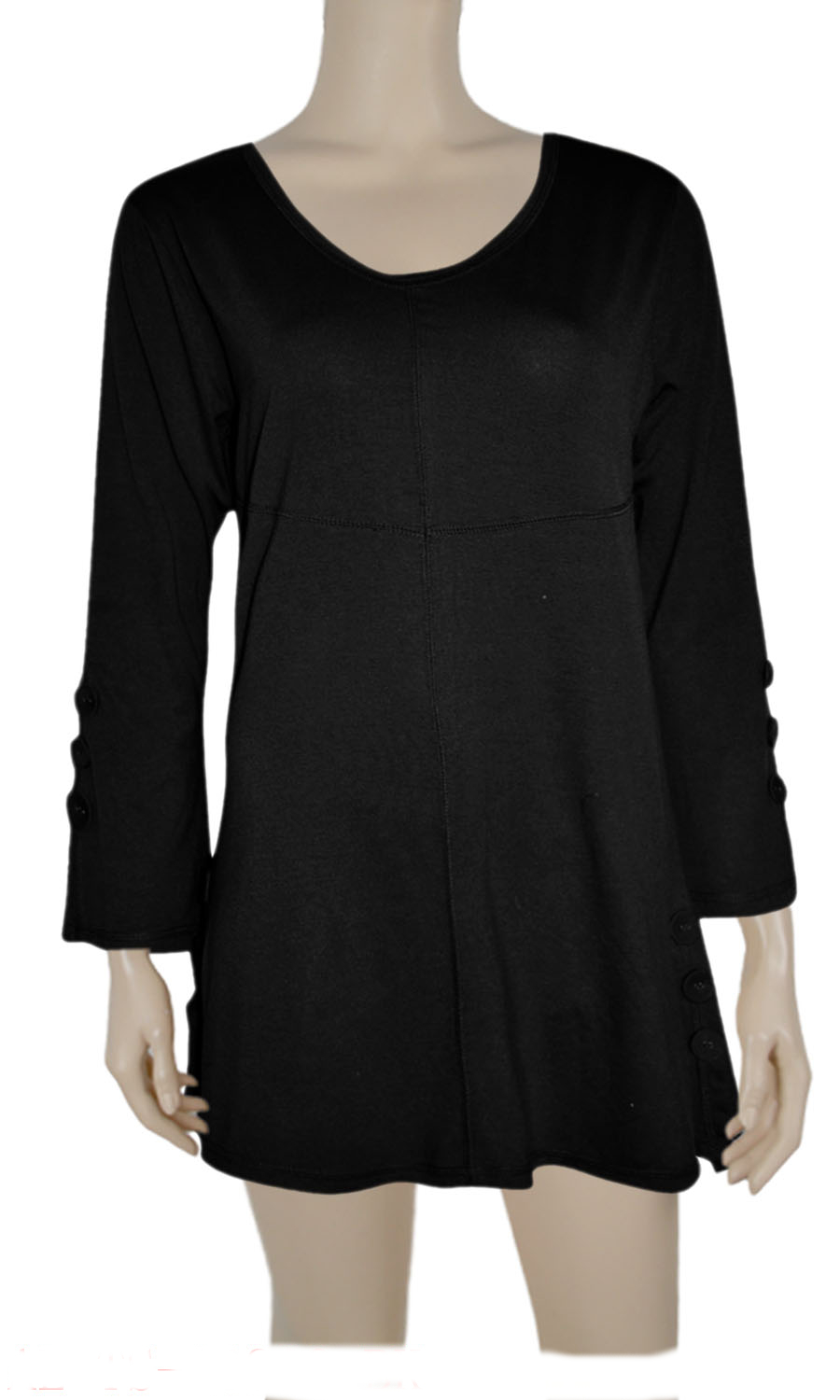 Classy versatile tunic. Round neck. Long sleeve split on each side up from bottom hem with 3 large decorative buttons. Spilt on each side from bottom of sleeve with 3 large decorative buttons. Plain front and back with decorative seam around chest. Add a scarf pair of leggings and be fashionable and comfortable. Made of 70% polyester/30% cotton. Hand wash or dry clean.